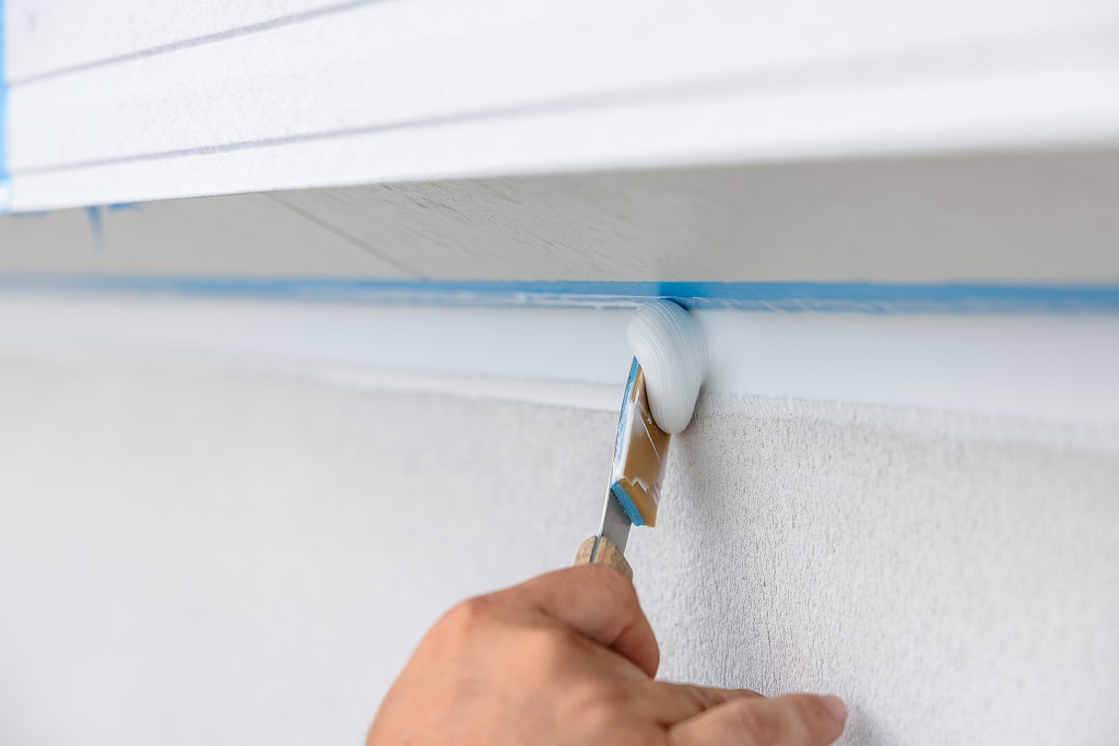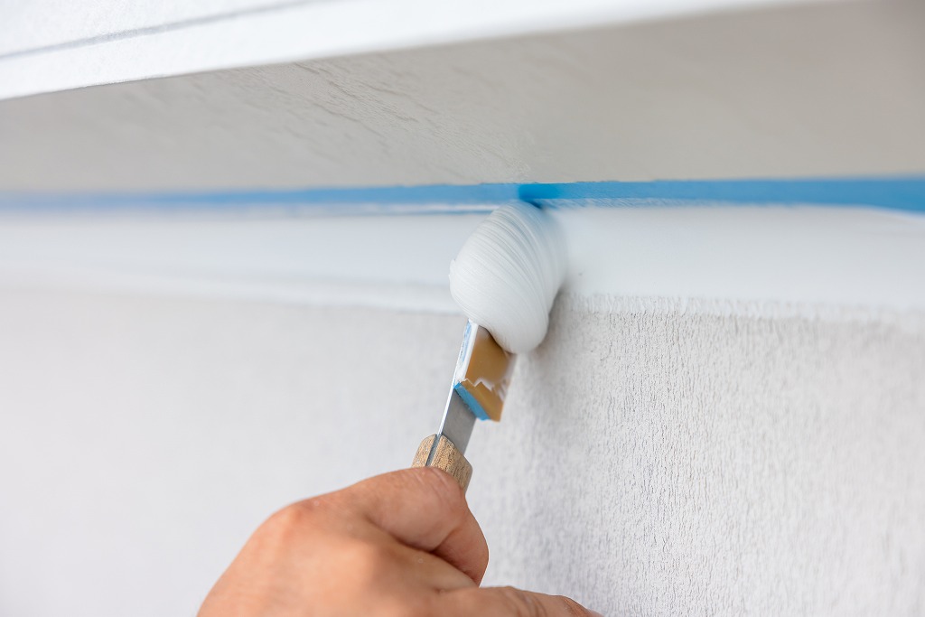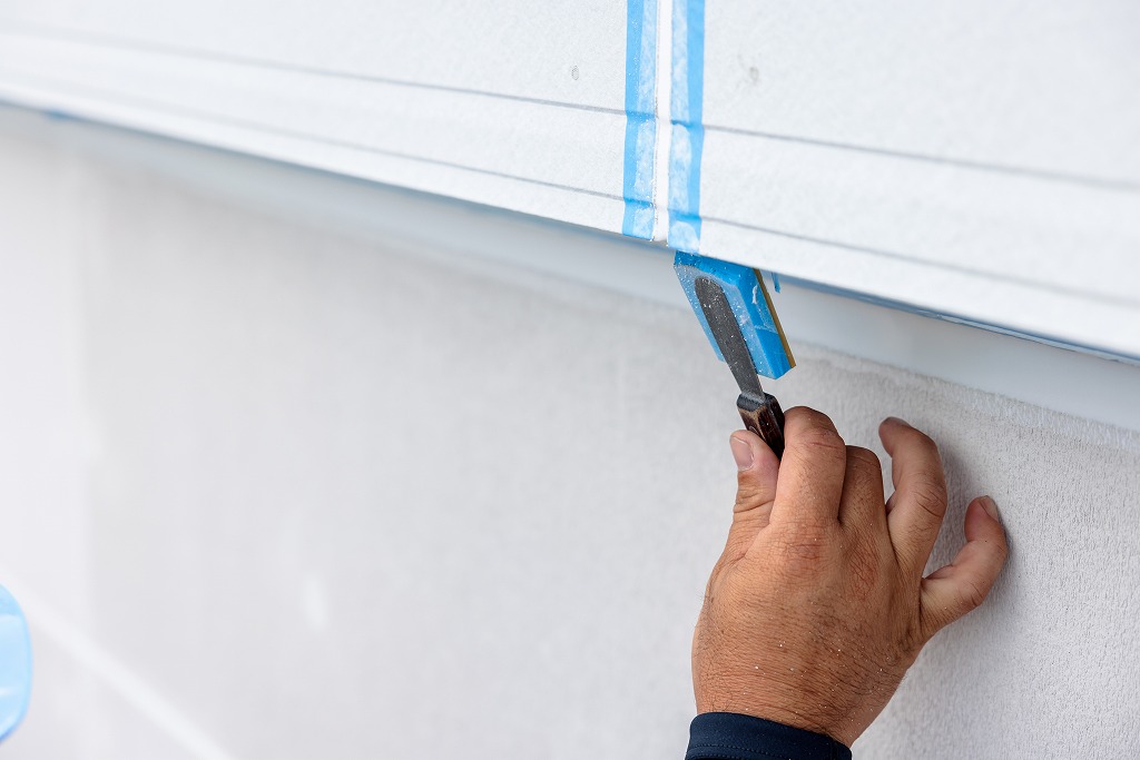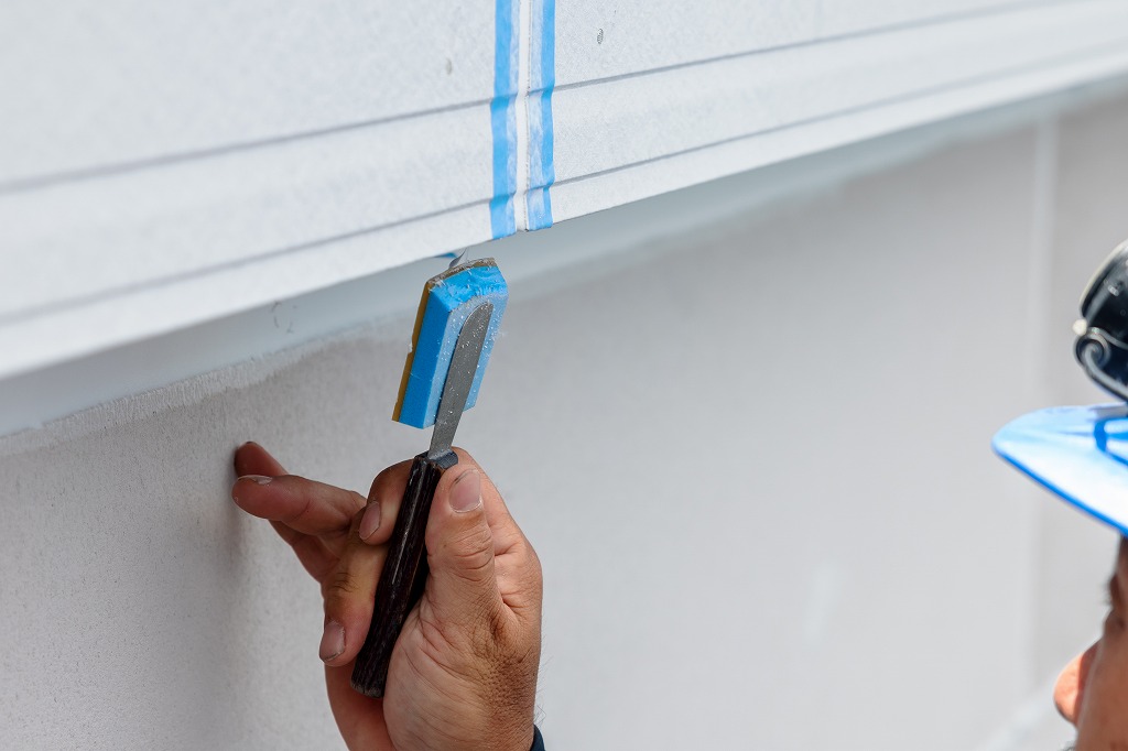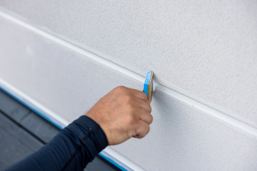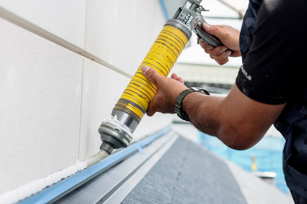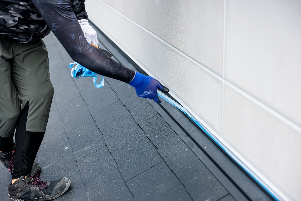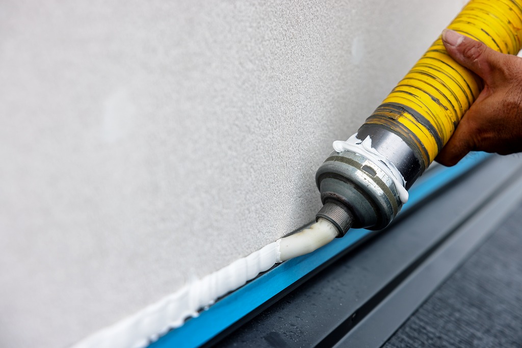 コーキングガンと呼ばれる道具を使用して、シーリング材を目地に充填します。どのようなシーリング材を選ぶかや、コーキングガンのノズルのサイズや形が適切かどうか、気泡が混入していないかなど、職人の判断と技術によって最終的な仕上がりが影響を受けます。充填されたシーリング材をヘラを使って押さえて圧着させることで、密着性を向上させると同時に、余分なシーリング材を取り除き、表面をきれいに整える作業を繰り返し仕上げていきます。